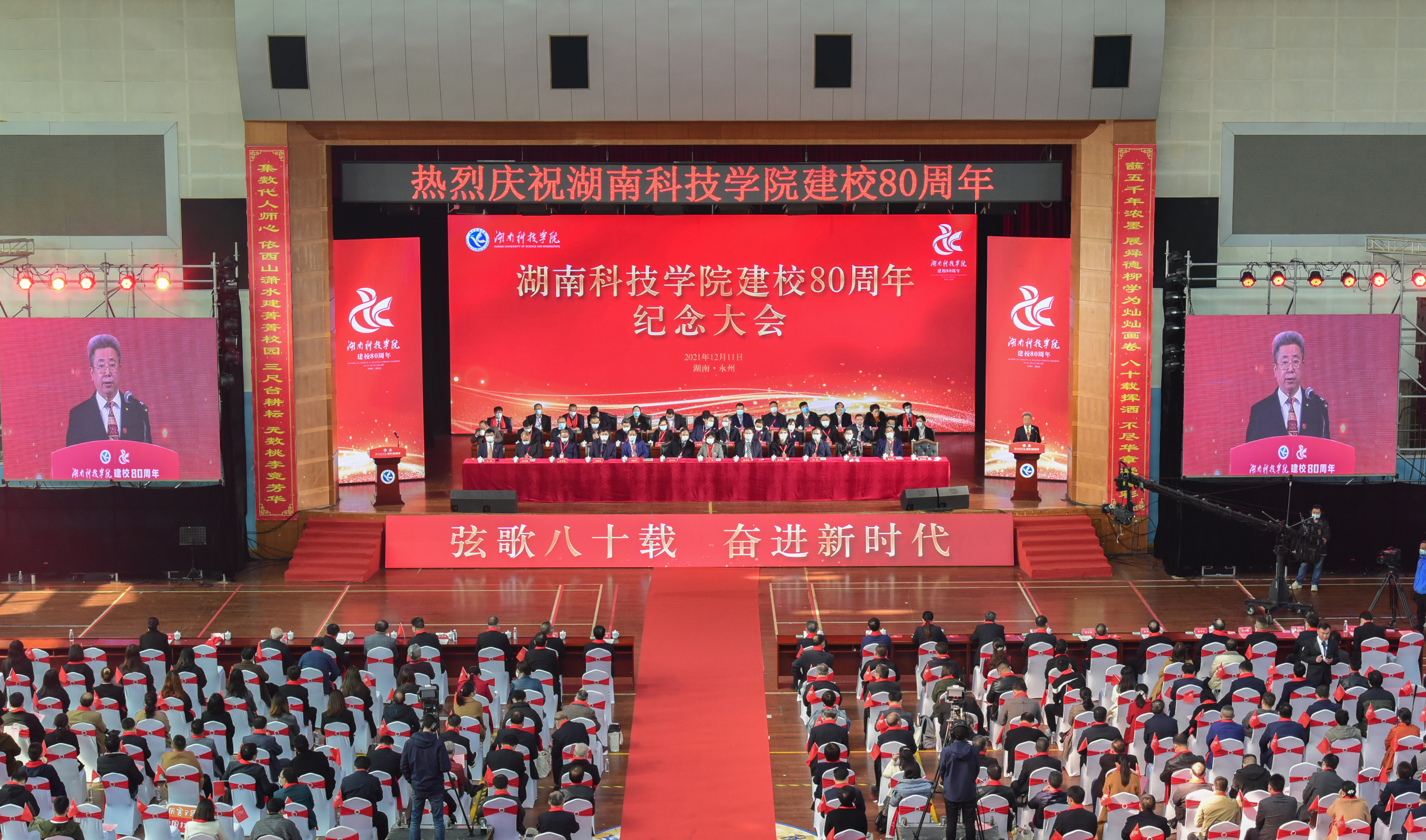 本网讯(记者 宁央贝 余佳佳)弦歌不辍八十载,薪火相传谱华章。12月11日,学校建校80周年纪念大会在体育馆隆重举行。湖南省教育厅党组成员、副厅长、省委教育工委委员左清,中共永州市委副书记、代市长陈爱林,副市长谢景林出席大会。全体校领导、党委委员,地方政府代表,兄弟学院代表,校友代表与在校师生共一千二百余人欢聚一堂,共襄盛典。