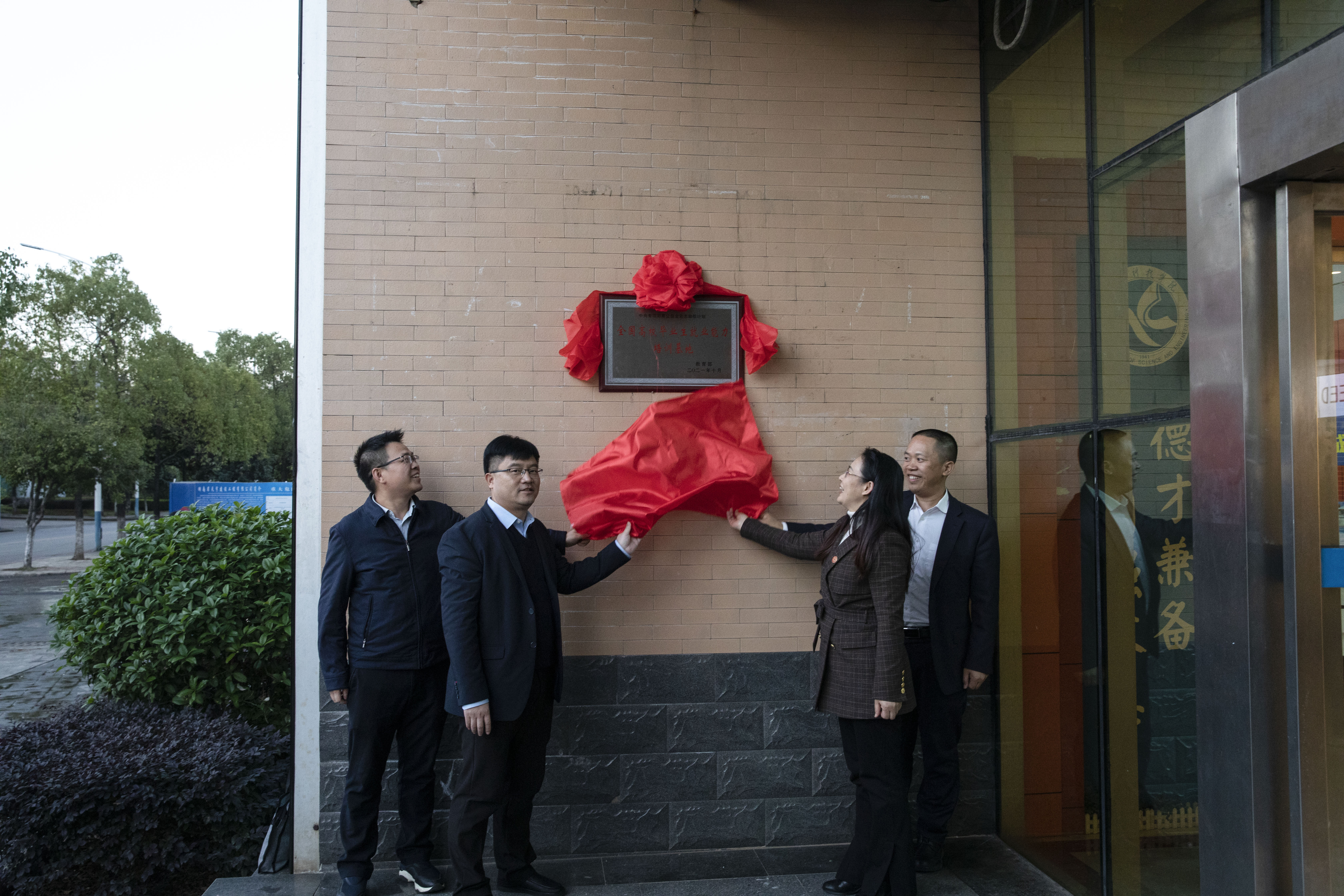钟秋明、颜慧林、李钢、郑银芳共同为“‘中央专项彩票公益金宏志助航计划’全国高校毕业生就业能力培训基地”揭牌。