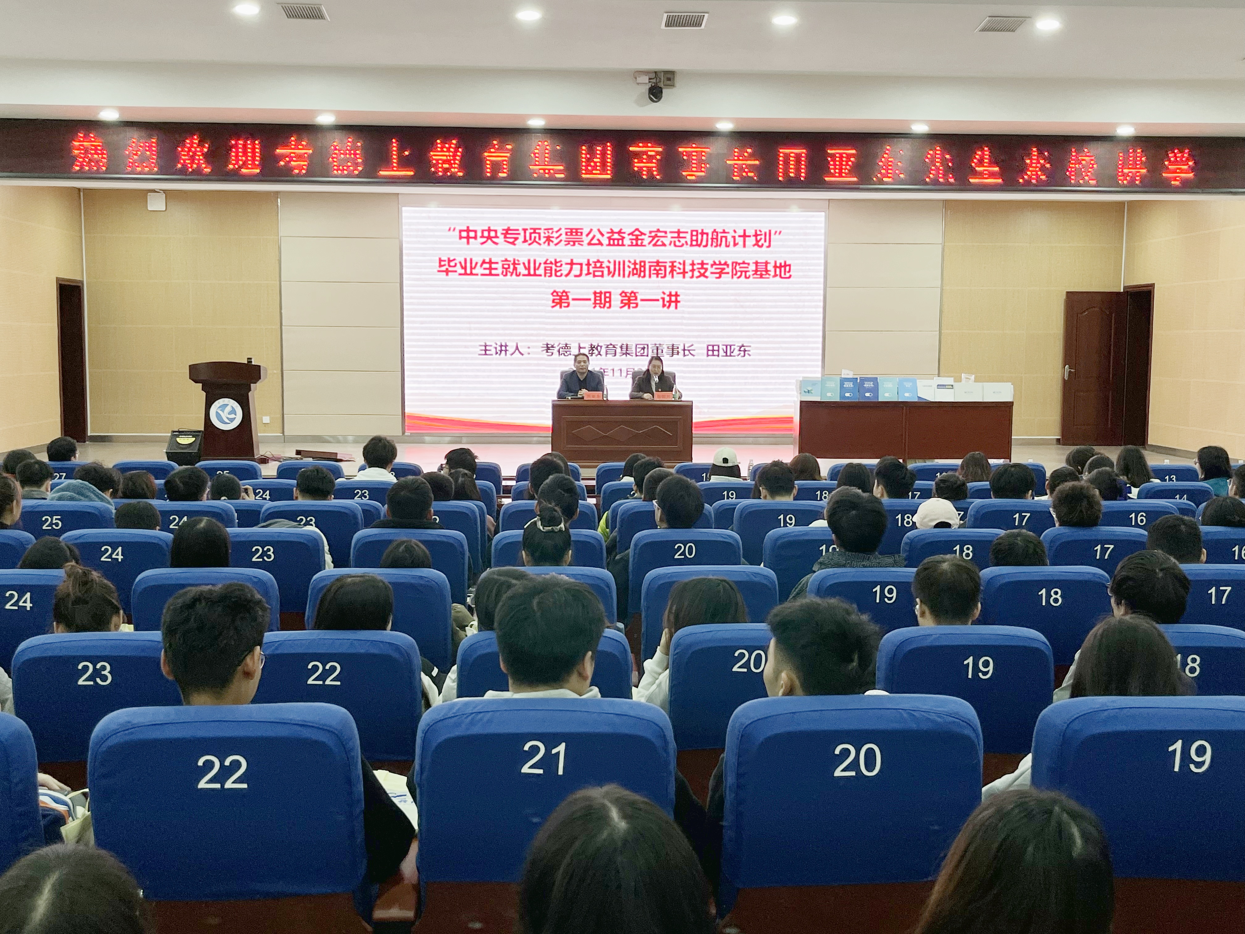 揭牌仪式后,著名“清廉公考”首倡者、我国“公考面试之父”、考德上教育集团董事长田亚东教授来到“全国高校毕业生就业能力培训”第一期大讲堂,为600余名同学做了首场就业能力培训指导讲座。他结合自己的公职人员从业经历和公考培训经验,从公职人员类型、公职人员发展方向、公职人员必备素质与能力、公职人员选拔形式、大学生职业规划与情商提升等方面做了详尽而生动的阐释,鼓励大学生们注重就业能力的培养与锻炼,赢得现场同学的阵阵掌声与喝彩。