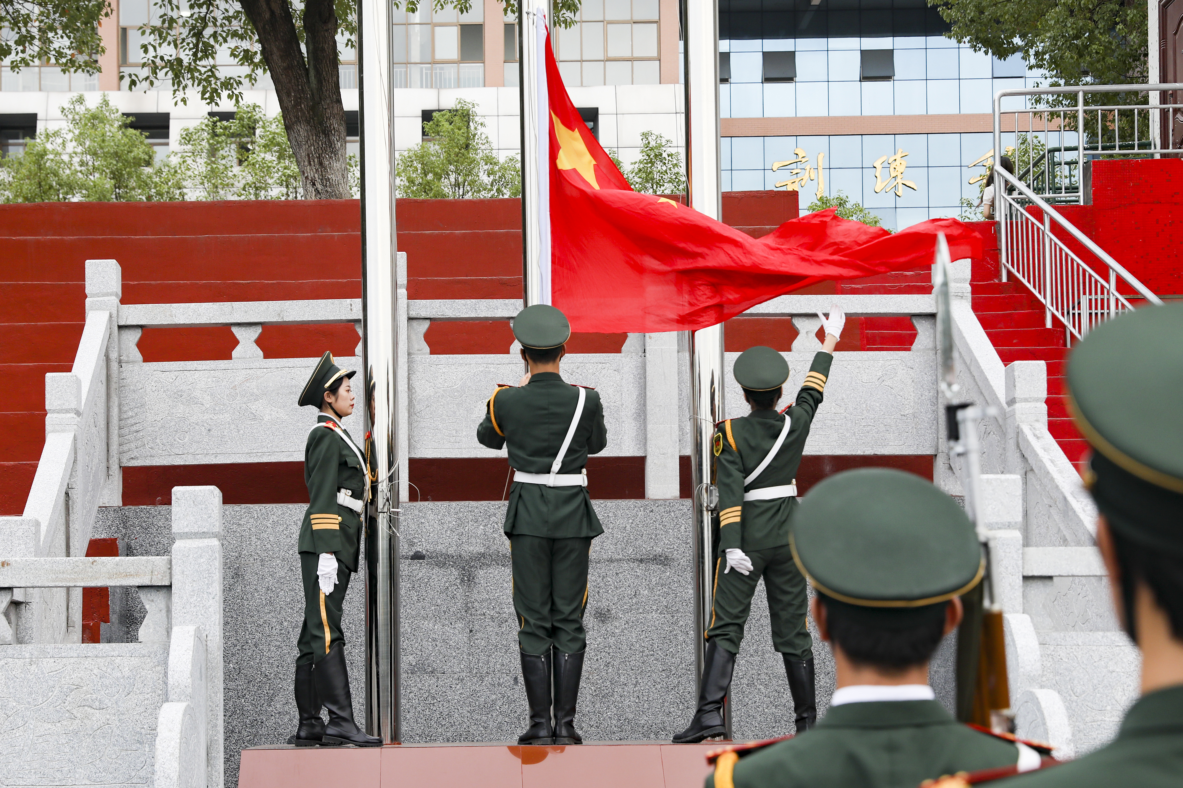 上午7时,伴随庄严的中华人民共和国国歌,鲜红的五星红旗冉冉升起,全校师生肃立行注目礼向国旗致敬。