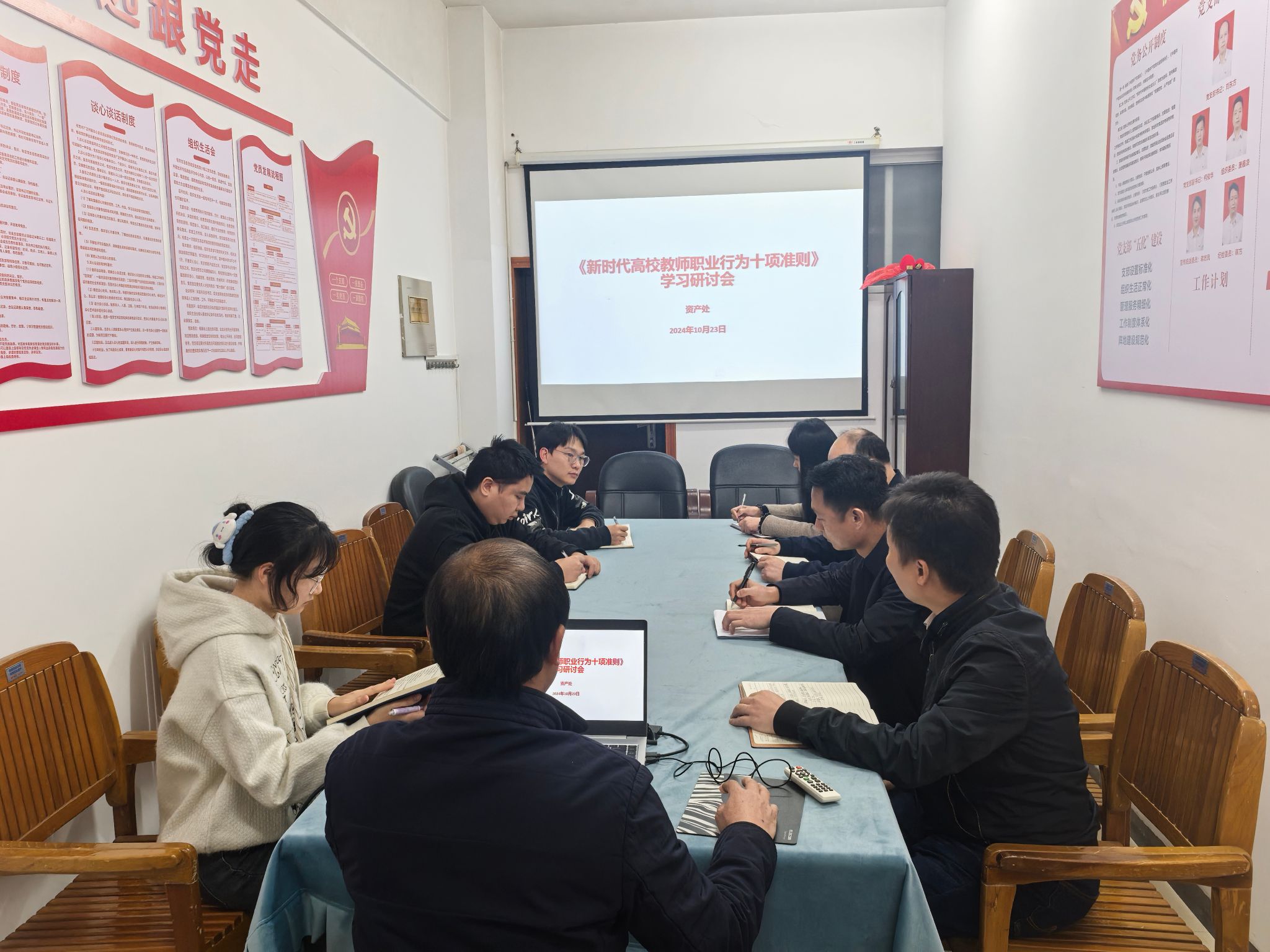 为推进师德师风建设工作,进一步夯实新时代教师立德树人的责任。10月23日下午,资产处在行政楼318会议室开展了《新时代高校教师职业行为十项准则》学习研讨会。资产处全体成员参会,会议由资产处处长刘东方主持。